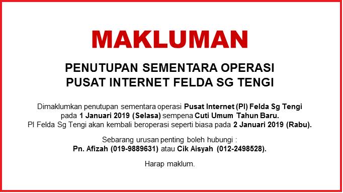 Assalamualaikum dan selamat sejahtera,Sempena cuti umum Hari Krismas, PI Felda Sg Tengi tidak akan beroperasi pada 25 Disember 2018 (Selasa). Harap maklum.