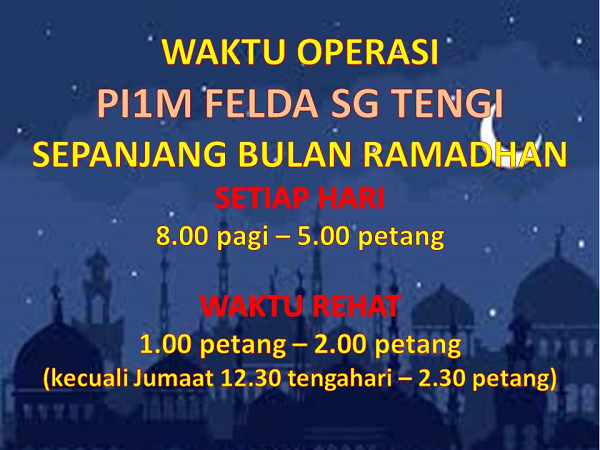 Assalamualaikum dan selamat sejahtera. Sempena cuti umum Hari Raya Puasa, PI Felda Sg Tengi tidak akan beroperasi pada 14-17 Jun 2018 (Khamis-Ahad). Harap maklum.