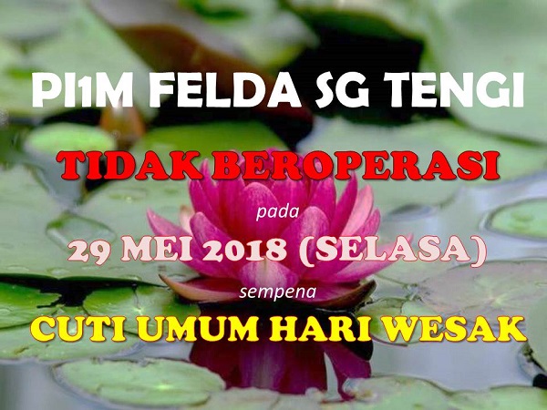 Assalamualaikum dan selamat sejahtera. Sempena cuti umum Hari Wesak, PI Felda Sg Tengi tidak akan beroperasi pada 29 Mei 2018 (Selasa). Harap maklum.
