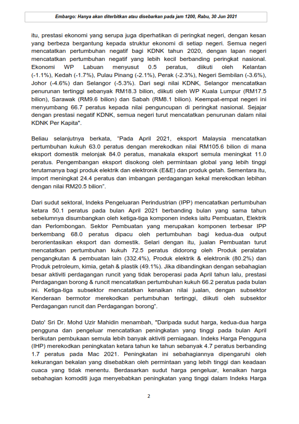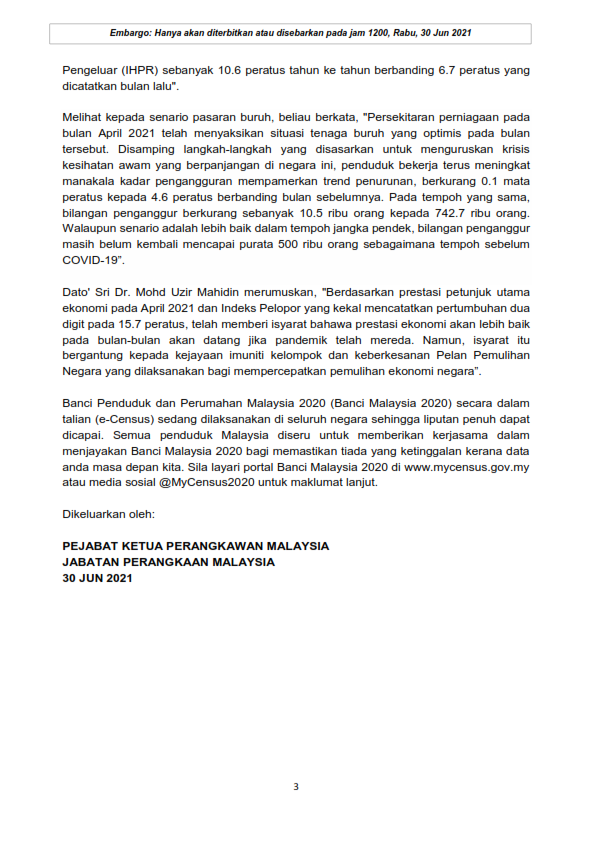 DOSM : SOROTAN STATISTIK EKONOMI MALAYSIA MESR SIRI 7/2021