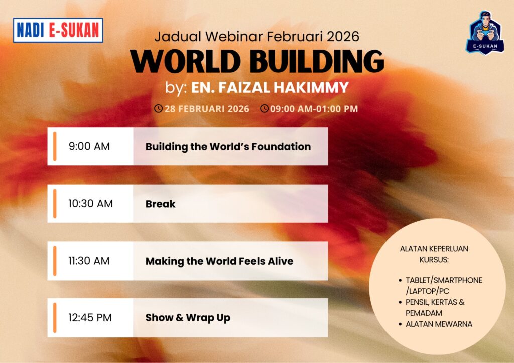 Webinar ini bertujuan memberi pendedahan mengenai konsep dan asas world building, termasuk pembinaan latar dunia, struktur persekitaran, budaya, naratif serta elemen visual yang menyokong pembangunan animasi, permainan dan kandungan digital secara lebih menyeluruh dan tersusun. Sijil penyertaan disediakan.