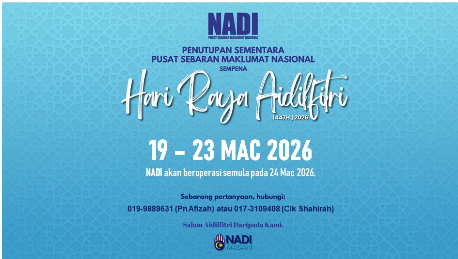 Assalamualaikum dan Salam Sejahtera Untuk makluman, NADI Felda Sungai Tengi tidak akan beroperasi buat sementara waktu pada 19 – 23 Mac 2026 (Khamis – Isnin) sempena Menyambut Hari Raya Aidilfitri 2026. NADI akan beroperasi semula pada 24 Mac 2026 (Selasa). Sekian, terima kasih. SELAMAT HARI RAYA AIDILFITRI, MAAF ZAHIR & BATIN.